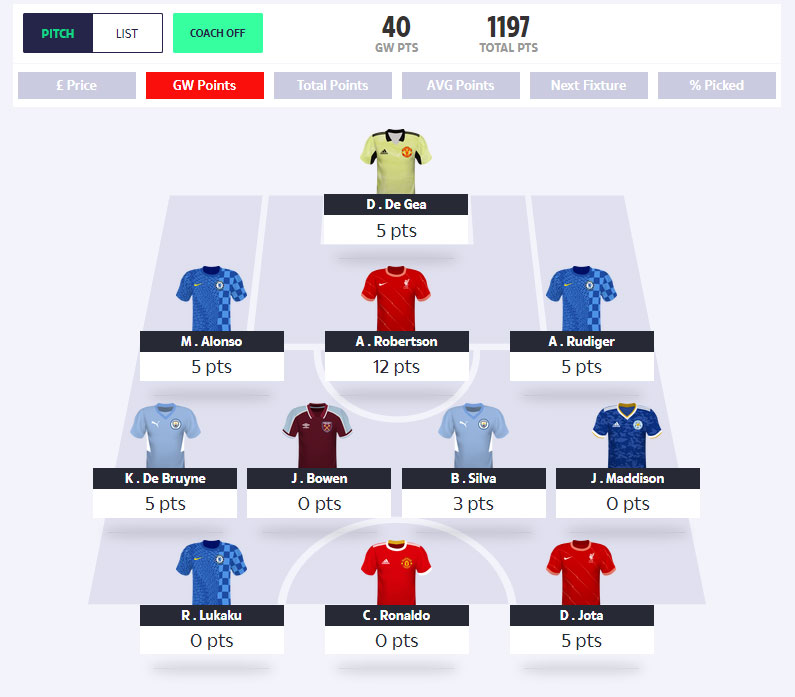Clean sheets for De Gea, Rudiger and Alonso, it’s a shame they all only got 5 points each but happy with the points either way.
