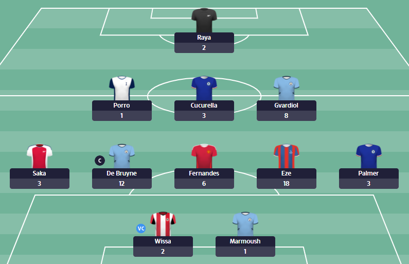 A slightly frustrating game week, I should have probably gone with the majority and bought in Mbeumo rather than Wissa so it was a gamble that didn’t pay off. This resulted in a very slight drop on the leaderboard. It felt very much like a bullet dodged with Haaland though as I didn’t expect him to start. Cucurella hasn’t done much recently after a good start in my team as well, he’s a slight differential who I could do with putting in some good performances. Eze was a particular highlight this week as his ownership within the top 1,000 isn’t huge at 44%.